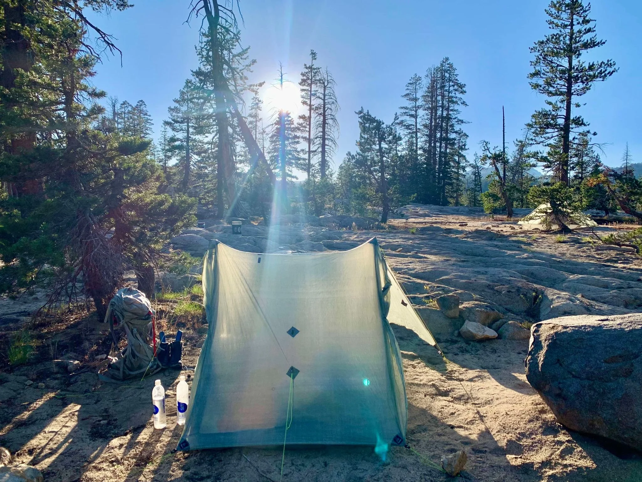 My last camp on this PCT section hike. I was lucky to be with Nurries who had camped here before. He led us away from the forest camp spots on the trail to the northern shore. Among the huge granite boulders there are perfect camp spots aplenty. It’s private and offers impeccable swimming opportunities. No mozzies! Sheltered by trees and boulders, this would be a great camp even in a storm. It was such a great last camp after a 20 mile day, and the miles leading to it are completely flat – so you can cruise in right over the finish line with a smile without breaking a sweat.